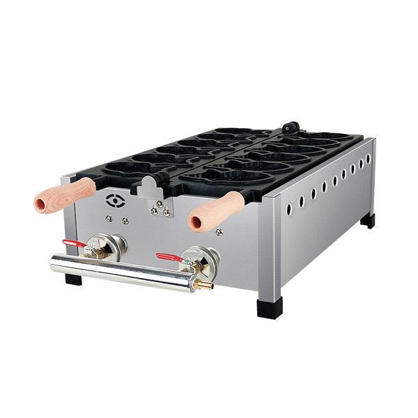 Commercial gas taiyaki waffle machine made with durable stainless steel for long-term professional use. Gas powered heating provides fast heat-up time and high thermal efficiency, reducing energy costs. Features non-stick fish shaped waffle plates that produce authentic Japanese taiyaki with a perfectly crispy exterior and soft interior. Supports various fillings including red bean, custard, chocolate, sweet potato, and cream cheese. Precise flame control ensures even browning and consistent results batch after batch. Easy to operate and clean. Ideal for Japanese restaurants, dessert shops, bubble tea stores, cafes, Asian street food stalls, and event catering.